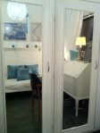- När vi gjorde badrummet större 2008 blev rummet utanför badrummet ett genomgångsrum. När så en fransk student hörde av sig flera ggr i jakt på ett boende, tyckte jag synd om henne och frågade våran snickare Olle om det gick att göra något åt genomgångsrummet. Det hela slutade med att det blev ett litet rum på ca 8 m2, med skjutdörr och fyra spegelglasklädda garderober.