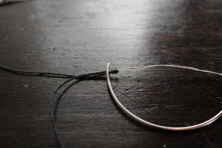 Sometimes it’s hard to thread a coarse thread through an eye of a needle. Use a thin thread, make a loop and then pull the coarser thread through the eye of the needle. Or buy a needle threader! Piece of cake! http://sewing.about.com/od/notions/ss/needlethreader.htm