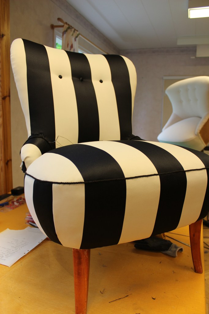 Mikaelas svart/vita fåtölj. Tyget är dubbelvävd mörkläggnindsgardin i 100 % polyester! Inte det lättaste att arbeta med. Men vad fin den blev!