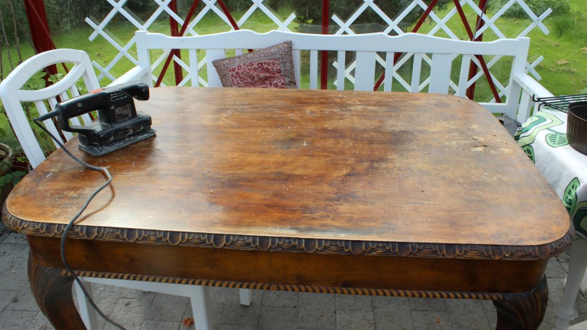 Det här bordet ska målas om för bordsskivan är ganska illa skadad på några ställen.