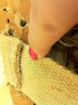 Jag tycker att det är svårt att veta hur mycket jag vågar klippa vid armstöd osv. Det här tipset fick jag av Sofia min lärare: Lägg en tygbit ovanpå det tyg som ska klippas och provklipp! Hur smart som helst, eller hur? Sedan är det bara att dra ner tyget och testa om klippet räcker.
