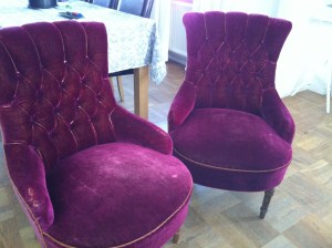 Så här ser i alla fall mina Emmor ut just nu. Jag fick tag i dem via Facebook för 500 kr/paret! Och hemkörda också! Tack så mycket! För att spara tid ska jag nu under veckan försiktigt ta loss tyget, snoddarna och knapparna. Undrar om jag fixar det? Tyget kommer jag att använda som mönster när jag klipper det nya tyget.